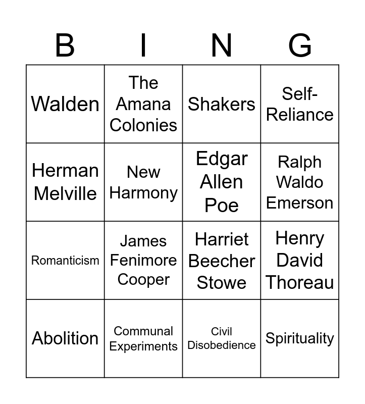 This bingo card has 16 words: Communal Experiments, Henry David Thoreau, Shakers, Walden, Romanticism, The Amana Colonies, Harriet Beecher Stowe, Civil Disobedience, Herman Melville, New Harmony, Abolition, Self-Reliance, James Fenimore Cooper, Ralph Waldo Emerson, Edgar Allen Poe and Spirituality.