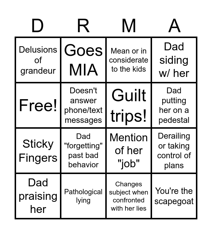 This bingo card has 16 words: Pathological lying, Derailing or taking control of plans, Mean or in considerate to the kids, Delusions of grandeur, Sticky Fingers, Goes MIA, Mention of her "job", Changes subject when confronted with her lies, Free!, Doesn't answer phone/text messages, Dad praising her, Dad siding w/ her, Dad "forgetting" past bad behavior, Dad putting her on a pedestal, Guilt trips! and You're the scapegoat.