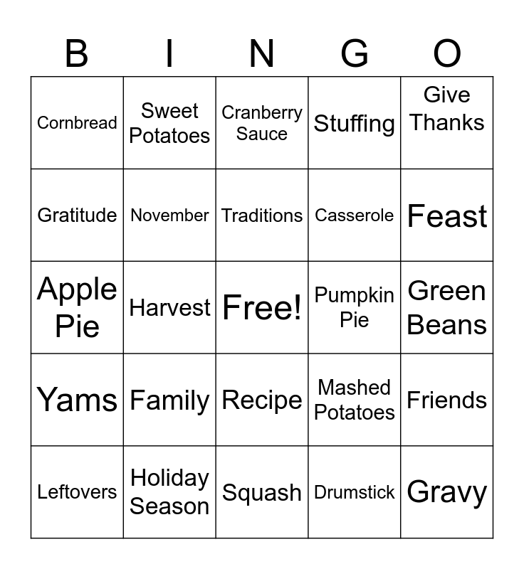 This bingo card has a free space and 24 words: Family, Holiday Season, Traditions, Leftovers, Give Thanks, Cornbread, Gratitude, Sweet Potatoes, Pumpkin Pie, Recipe, Casserole, Apple Pie, Mashed Potatoes, Friends, November, Drumstick, Green Beans, Cranberry Sauce, Feast, Harvest, Gravy, Yams, Stuffing and Squash.