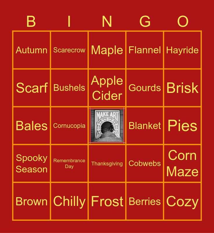 This bingo card has a free space and 63 words: Chestnuts, Pumpkin, Fall, Corn Maze, Harvest, Sweater, Scarecrow, Halloween, Apple Cider, Foilage, Thanksgiving, Bonfire, Pies, Hayride, Pumpkin Spiced Latte, Scarf, Cornucopia, Autumn, Farmer’s Market, Gourds, Remembrance Day, Spooky Season, Flannel, Turkey, September, October, November, Gobble Gobble, Boo!, Acorns, Amber, Apple, Aroma, Apricot, Brisk, Brown, Bark, Berries, Boots, Bushels, Bales, Blanket, Cranberries, Cinnamon, Cozy, Chilly, Clove, Cobwebs, Cocoa, Apple cider donuts, Fog, Frost, Festival, Costumes, Harvest Moon, Maple, Mittens, Beanies, S’mores, Pine cones, Colorful Leaves, Soup and Trick or Treat.