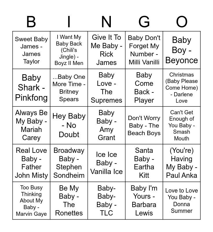 This bingo card has 40 words: Baby - Justin Bieber, Always Be My Baby - Mariah Carey, Baby Got Back - Sir Mix-A-Lot, ...Baby One More Time - Britney Spears, Be My Baby - The Ronettes, Ice Ice Baby - Vanilla Ice, Baby Love - The Supremes, Baby I Need Your Loving - Four Tops, Baby Boy - Beyonce, Real Love Baby - Father John Misty, Hey Baby - No Doubt, Baby Don't Forget My Number - Milli Vanilli, Baby Baby - Amy Grant, Can't Get Enough of You Baby - Smash Mouth, Don't Worry Baby - The Beach Boys, Broadway Baby - Stephen Sondheim, Bye Bye Baby - Bay City Rollers, Sweet Baby James - James Taylor, Steppin' Out With My Baby - Fred Astaire, Give It To Me Baby - Rick James, (You're) Having My Baby - Paul Anka, Baby I'm Yours - Barbara Lewis, Baby Come Back - Player, Baby Shark - Pinkfong, Baby, I Love Your Way - Peter Frampton, Industry Baby - Lil Nas X, Be My Baby Tonight - John Michael Montgomery, Baby Jane - Rod Stewart, Love to Love You Baby - Donna Summer, There Goes My Baby - The Drifters, American Baby - Dave Matthews Band, Too Busy Thinking About My Baby - Marvin Gaye, Baby It's Cold Outside - Zooey Deschanel & Leon Redbone, Santa Baby - Eartha Kitt, Christmas (Baby Please Come Home) - Darlene Love, Baby-Baby-Baby - TLC, Runaway Baby - Bruno Mars, Me and My Baby - Chicago, I Want My Baby Back (Chili's Jingle) - Boyz II Men and Baby Beluga - Raffi.
