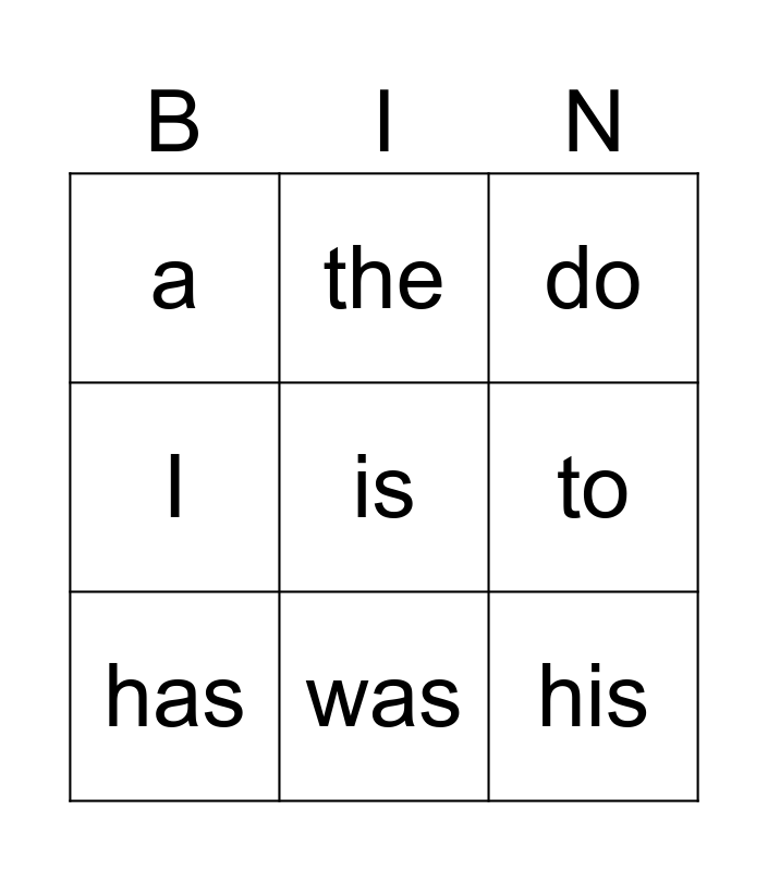 This bingo card has a free space and 8 words: to, do, the, has, a, his, I and was.