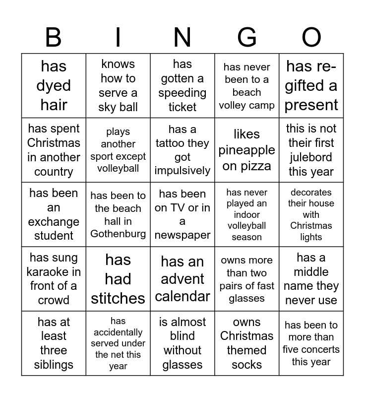 This bingo card has 25 words: has had stitches, is almost blind without glasses, has a tattoo they got impulsively, has at least three siblings, has re-gifted a present, has dyed hair, has spent Christmas in another country, knows how to serve a sky ball, has never played an indoor volleyball season, has an advent calendar, likes pineapple on pizza, has been an exchange student, owns more than two pairs of fast glasses, has a middle name they never use, plays another sport except volleyball, has been to more than five concerts this year, decorates their house with Christmas lights, has gotten a speeding ticket, this is not their first julebord this year, has been to the beach hall in Gothenburg, has been on TV or in a newspaper, has accidentally served under the net this year, has sung karaoke in front of a crowd, has never been to a beach volley camp and owns Christmas themed socks.