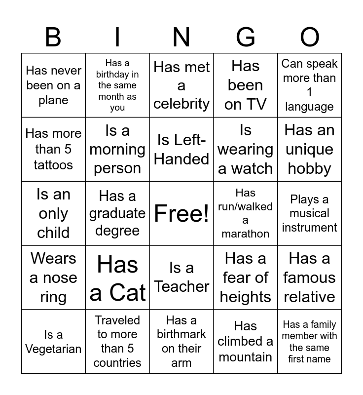 This bingo card has a free space and 24 words: Has a Cat, Traveled to more than 5 countries, Is Left-Handed, Is a Vegetarian, Can speak more than 1 language, Has never been on a plane, Has more than 5 tattoos, Has a birthday in the same month as you, Has run/walked a marathon, Is a Teacher, Is wearing a watch, Is an only child, Has a fear of heights, Has a famous relative, Is a morning person, Has climbed a mountain, Plays a musical instrument, Has met a celebrity, Has an unique hobby, Has a graduate degree, Has a family member with the same first name, Wears a nose ring, Has been on TV and Has a birthmark on their arm.