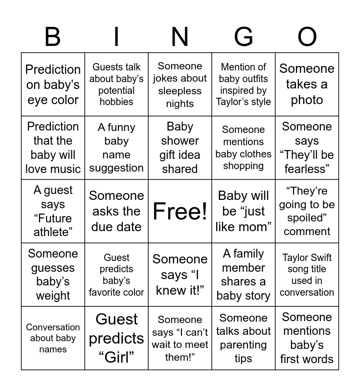 This bingo card has a free space and 30 words: Guest predicts “Girl”, Guest predicts “Boy”, Someone asks the due date, Prediction on baby’s hair color, Prediction on baby’s eye color, Someone jokes about sleepless nights, A funny baby name suggestion, Someone says “I knew it!”, Baby will be “just like mom”, Someone says “I can’t wait to meet them!”, “They’re going to be spoiled” comment, Someone mentions baby’s first words, Someone talks about parenting tips, Someone jokes about diaper changes, Someone says “They’ll be fearless”, A guest talks about the nursery, A family member shares a baby story, Someone guesses baby’s weight, Guest predicts baby’s favorite color, Someone takes a photo, A guest says “Future athlete”, Baby’s star sign prediction, Guests talk about baby’s potential hobbies, Someone mentions baby clothes shopping, Prediction that the baby will love music, Mention of baby outfits inspired by Taylor’s style, Taylor Swift song title used in conversation, Conversation about baby names, Baby shower gift idea shared and Guests exchange friendship bracelets.