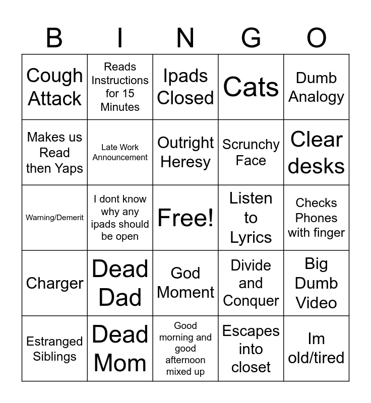 This bingo card has a free space and 24 words: Dead Dad, Dead Mom, Outright Heresy, Estranged Siblings, Dumb Analogy, Cough Attack, Makes us Read then Yaps, Reads Instructions for 15 Minutes, Listen to Lyrics, God Moment, Scrunchy Face, Warning/Demerit, Divide and Conquer, Big Dumb Video, Late Work Announcement, Escapes into closet, Checks Phones with finger, Ipads Closed, Clear desks, I dont know why any ipads should be open, Im old/tired, Charger, Cats and Good morning and good afternoon mixed up.