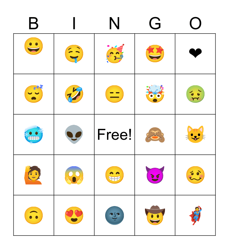 This bingo card has a free space and 24 words: 😱, 😍, 😑, 🙃, ❤, 😀, 😴, 🤤, 🙈, 😁, 🤯, 🥶, 😈, 🥴, 🤣, 🤠, 😺, 🥳, 🤢, 👽, 🦸, 🙋, 🤩 and 🌚.