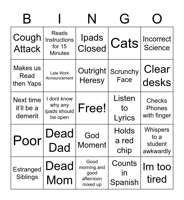 This bingo card has a free space and 24 words: Dead Dad, Dead Mom, Outright Heresy, Estranged Siblings, Incorrect Science, Cough Attack, Makes us Read then Yaps, Reads Instructions for 15 Minutes, Listen to Lyrics, God Moment, Scrunchy Face, Next time it’ll be a demerit, Holds a red chip, Whispers to a student awkwardly, Late Work Announcement, Counts in Spanish, Checks Phones with finger, Ipads Closed, Clear desks, I dont know why any ipads should be open, Im too tired, Poor, Cats and Good morning and good afternoon mixed up.