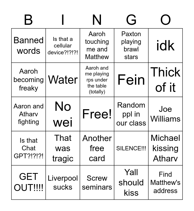 This bingo card has a free space and 27 words: SILENCE!!!, STOP TOUCHING ME!!, Fein, Screw seminars, Aaroh becoming freaky, Aaroh touching me and Matthew, Is that a cellular device?!?!?!, Is that Chat GPT?!?!?!, Random ppl in our class, Michael kissing Atharv, Aaron and Atharv fighting, Paxton playing brawl stars, GET OUT!!!!, Liverpool sucks, Thick of it, Ray, Water, Aaroh and me playing rps under the table (totally), That was tragic, Banned words, Joe Williams, Yall should kiss, No wei, Find Matthew's address, Another free card, idk and Ishaan's table.