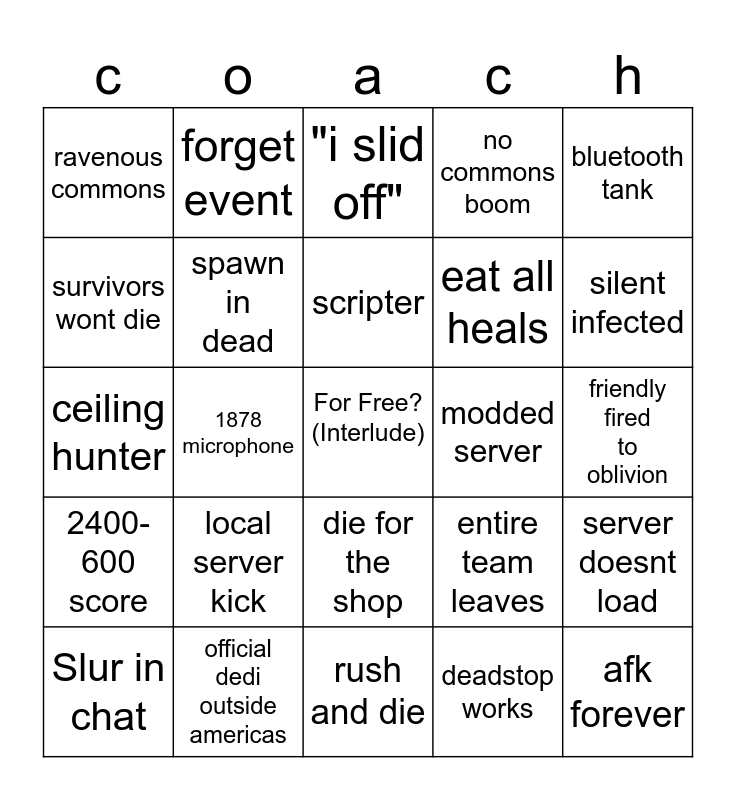 This bingo card has a free space and 29 words: Slur in chat, Stream sniper, 1878 microphone, holding infected forever, ravenous commons, "i slid off", spawn in dead, local server kick, modded server, official dedi outside americas, friendly fired to oblivion, afk forever, rush and die, deadstop works, silent infected, team doesnt clear, die for the shop, 2400-600 score, bluetooth tank, ceiling hunter, entire team leaves, 0 dmg tank, eat all heals, survivors wont die, no commons boom, forget event, server doesnt load, scripter and "is that judex".