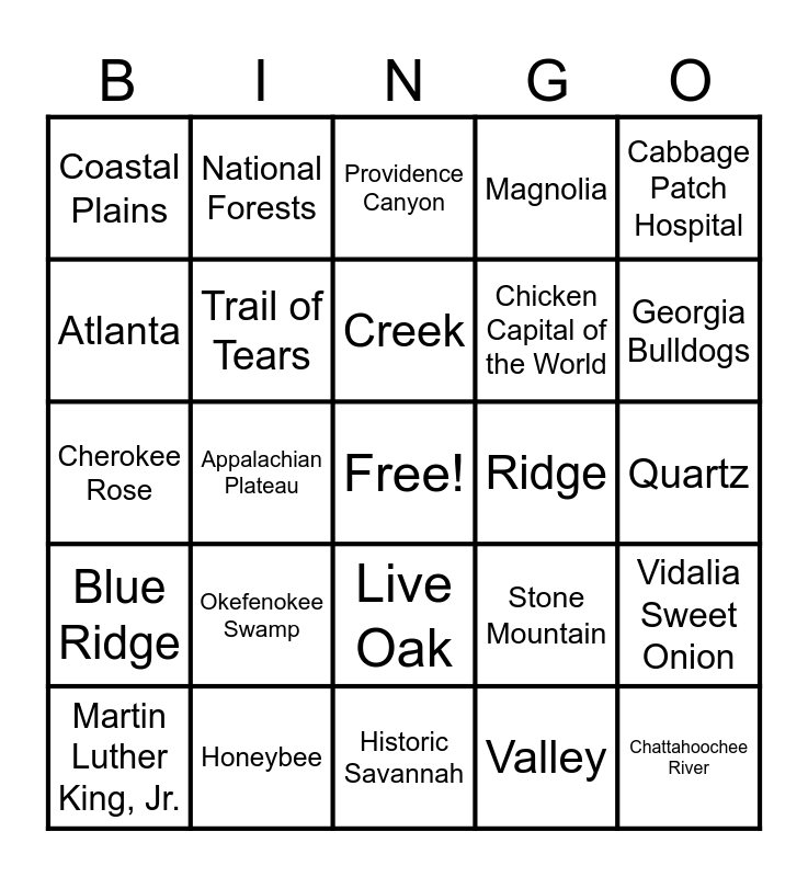 This bingo card has a free space and 35 words: Brown Thrasher, Peach, Cotton, Trail of Tears, Live Oak, Magnolia, Atlanta, Jimmy Carter, Creek, Moultrie, Cherokee Rose, Cabbage Patch Hospital, Free, Piedmont, Coastal Plains, Ridge, Valley, Appalachian Plateau, Blue Ridge, Chattahoochee River, Stone Mountain, Martin Luther King, Jr., Vidalia Sweet Onion, Honeybee, Providence Canyon, Georgia Bulldogs, Peanuts, Amicalola Falls, Chicken Capital of the World, Quartz, Brasstown Bald, Historic Savannah, Okefenokee Swamp, National Forests and 13th colony.