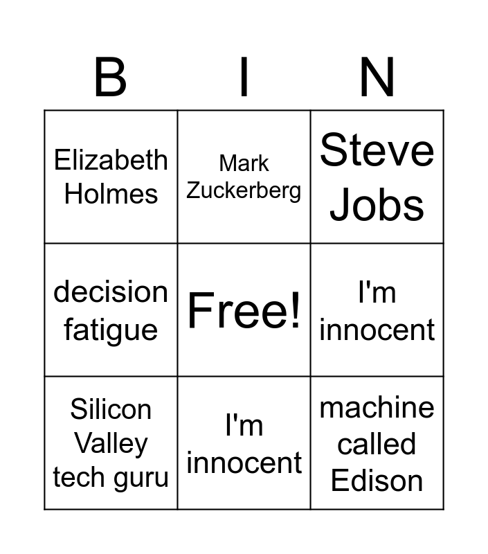 This bingo card has a free space and 9 words: Silicon Valley tech guru, Steve Jobs, Mark Zuckerberg, decision fatigue, Elizabeth Holmes, I'm innocent, machine called Edison, all a façade and I'm innocent.