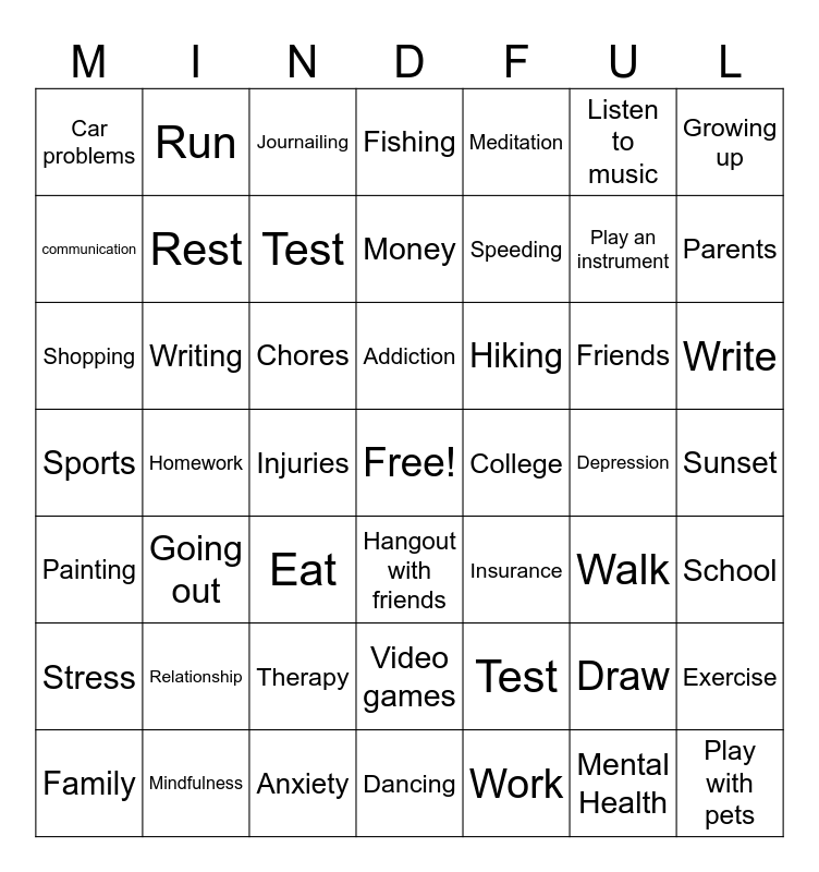 This bingo card has a free space and 48 words: Test, Play an instrument, Dancing, Homework, Chores, Sunset, Run, Mindfulness, Listen to music, Hangout with friends, Growing up, Fishing, Friends, Hiking, Stress, Depression, communication, Parents, Draw, Meditation, Speeding, Injuries, Car problems, Rest, Exercise, Test, Write, Family, Addiction, Writing, Mental Health, College, School, Relationship, Sports, Insurance, Walk, Shopping, Eat, Therapy, Painting, Play with pets, Journailing, Anxiety, Money, Video games, Going out and Work.