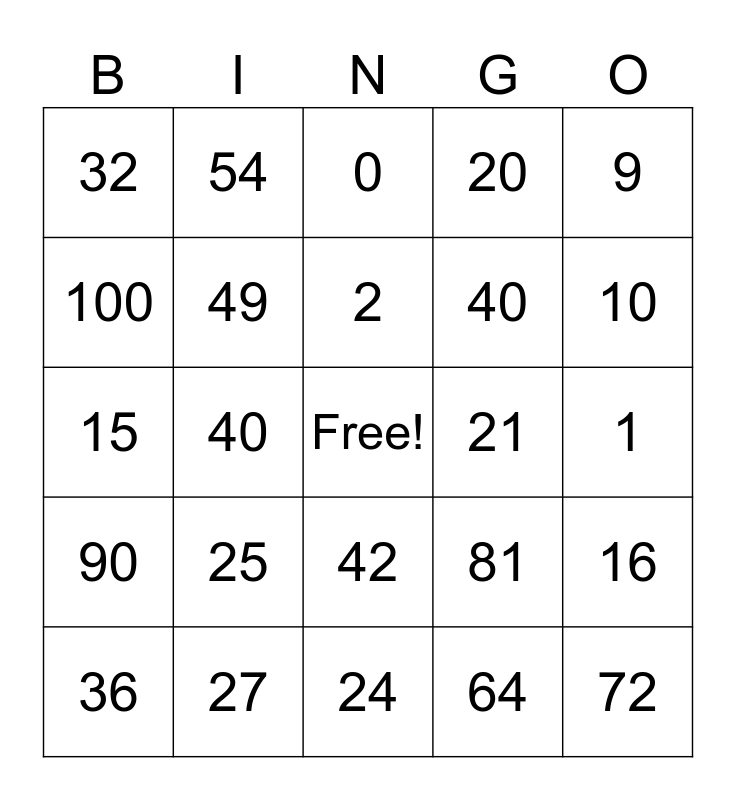 This bingo card has a free space and 24 words: 25, 27, 2, 36, 9, 32, 100, 54, 21, 42, 40, 15, 81, 16, 49, 64, 1, 0, 10, 40, 72, 90, 20 and 24.
