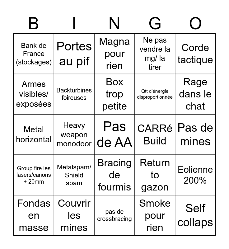 This bingo card has 30 words: Couvrir les mines, Portes 3 et + de long, Heavy weapon monodoor, Rush multitech (4 tek), Bank de France (stockages), Magna pour rien, Backturbines foireuses, Bracing de fourmis, CARRé Build, pas de crossbracing, Pas de mines, Pas de AA, Smoke pour rien, Self collaps, Rage dans le chat, Vol de mine/de place/de vent, Return to gazon, Group fire les lasers/canons + 20mm, Metalspam/ Shield spam, Corde tactique, Metal horizontal, PAS D'ARMES LOURDES, Portes au pif, Qtt d'énergie disproportionnée, Armes visibles/ exposées, Ne pas vendre la mg/ la tirer, Eolienne 200%, Fondas en masse, Box trop petite and Porte shield (on/off).
