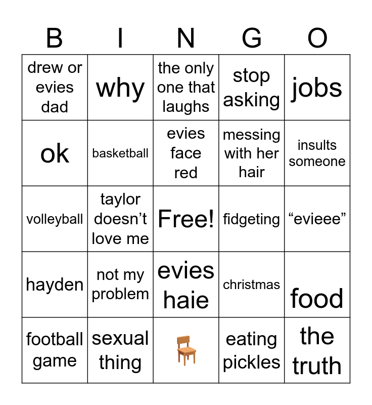 This bingo card has a free space and 24 words: not my problem, sexual thing, evies face red, football game, jobs, drew or evies dad, ok, why, fidgeting, evies haie, messing with her hair, volleyball, christmas, food, basketball, eating pickles, “evieee”, the only one that laughs, insults someone, taylor doesn’t love me, the truth, hayden, stop asking and 🪑.