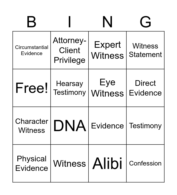 This bingo card has 16 words: Witness, Testimony, Expert Witness, Circumstantial Evidence, Character Witness, Attorney-Client Privilege, Evidence, Alibi, Free!, Hearsay Testimony, Physical Evidence, Witness Statement, DNA, Direct Evidence, Eye Witness and Confession.