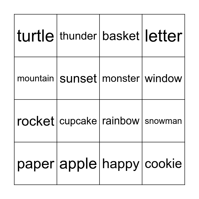 This bingo card has 21 words: apple, doctor, thunder, puzzle, happy, monster, turtle, basket, rainbow, window, rocket, letter, cookie, summer, sunset, pencil, paper, cupcake, mountain, snowman and tiger.