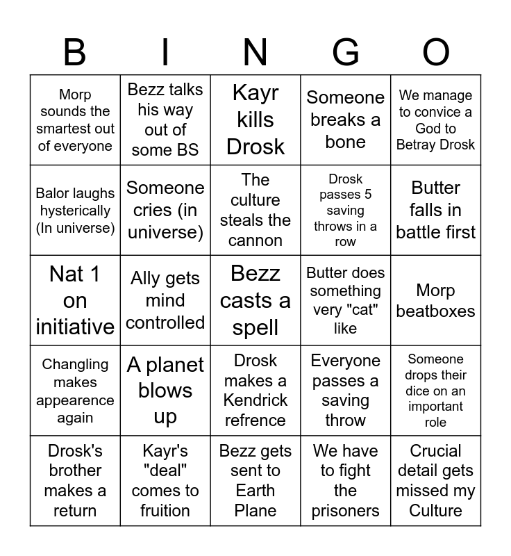 This bingo card has a free space and 24 words: A planet blows up, Kayr's "deal" comes to fruition, The culture steals the cannon, Drosk's brother makes a return, We manage to convice a God to Betray Drosk, Morp sounds the smartest out of everyone, Balor laughs hysterically (In universe), Bezz talks his way out of some BS, Butter does something very "cat" like, Drosk makes a Kendrick refrence, Drosk passes 5 saving throws in a row, Nat 1 on initiative, Everyone passes a saving throw, Someone drops their dice on an important role, Someone cries (in universe), We have to fight the prisoners, Morp beatboxes, Kayr kills Drosk, Butter falls in battle first, Ally gets mind controlled, Crucial detail gets missed my Culture, Changling makes appearence again, Someone breaks a bone and Bezz gets sent to Earth Plane.