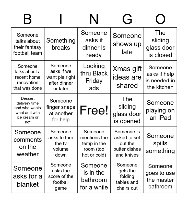 This bingo card has a free space and 24 words: Someone asks to turn the tv volume down, Someone asks the score of the football game, Looking thru Black Friday ads, Someone asks for a blanket, The sliding glass door is closed, Someone talks about their fantasy football team, Someone talks about a recent home renovation that was done, Something breaks, The sliding glass door is opened, Someone mentions the temp in the room (too hot or cold), Xmas gift ideas are shared, Dessert delivery time and who wants what and with ice cream or not, Someone is asked to set out the butter dishes and knives, Someone spills something, Someone asks if we want pie right after dinner or later, Someone gets the folding tables and chairs out, Someone playing on an iPad, Someone asks if dinner is ready, Someone asks if help is needed in the kitchen, Someone finger snaps at another for help, Someone goes to use the master bathroom, Someone comments on the weather, Someone shows up late and Someone is in the bathroom for a while.