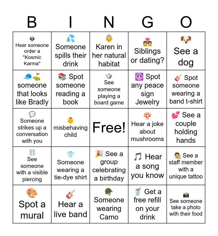 This bingo card has a free space and 24 words: ๐ Someone wearing a tie-dye shirt, ๐ธ Hear a live band, ๐ฒ See someone playing a board game, ๐จ Spot a mural, ๐ถ See a dog, ๐ฝ Hear someone order a "Kosmic Karma", ๐งขโณ someone that looks like Bradly, ๐ฆ Someone spills their drink, ๐ Hear a joke about mushrooms, ๐ See a group celebrating a birthday, โฎ๏ธ Spot any peace sign Jewelry, ๐ฌ Someone strikes up a conversation with you, ๐ต Hear a song you know, ๐งโ๐จ See a staff member with a unique tattoo, ๐ Spot someone reading a book, ๐ฅค Get a free refill on your drink, ๐ See a couple holding hands, ๐ต Karen in her natural habitat, ๐ธ Spot someone wearing a band t-shirt, ๐ถ misbehaving child, ๐ธ See someone take a photo with their food, โ๏ธ See someone with a visible piercing, ๐ Siblings or dating? and ๐ช Someone wearing Camo.