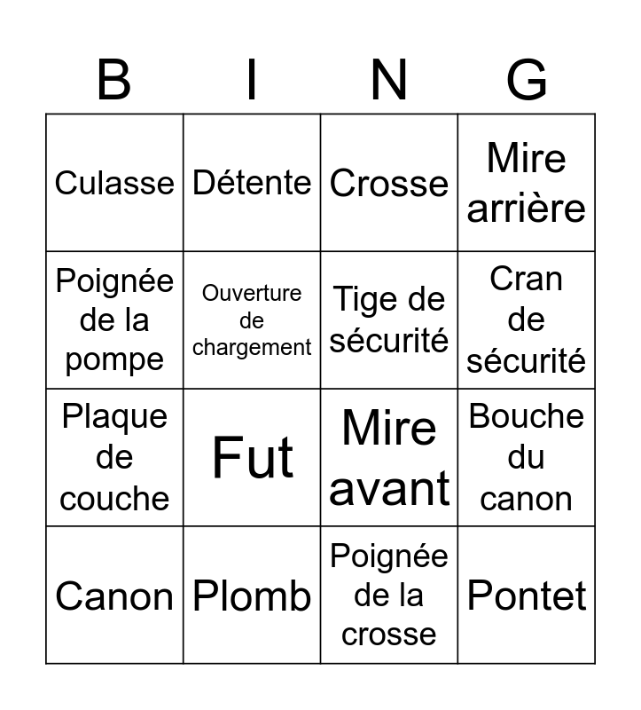 This bingo card has 18 words: Fut, Pontet, Crosse, Culasse, Mire avant, Mire arrière, Canon, Détente, Cran de sécurité, Plaque de couche, Poignée de la crosse, Poignée de la pompe, Bouche du canon, Ouverture de chargement, Tige de sécurité, Battant de bretelle, Plomb and Bretelle.