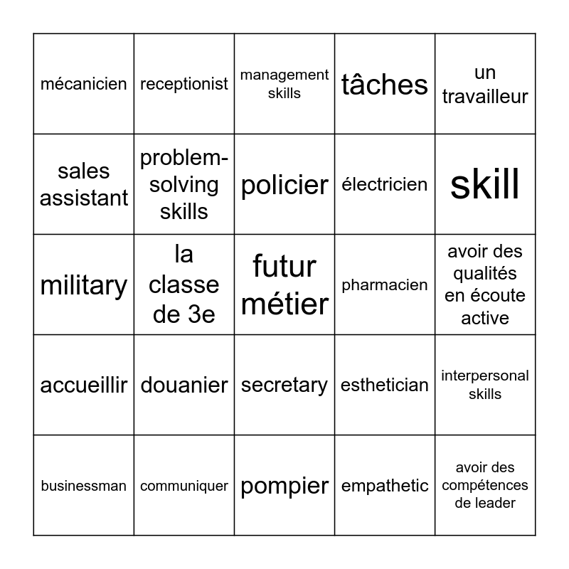 This bingo card has 25 words: douanier, pompier, policier, businessman, un travailleur, mécanicien, sales assistant, receptionist, pharmacien, secretary, électricien, military, esthetician, interpersonal skills, problem-solving skills, avoir des compétences de leader, avoir des qualités en écoute active, management skills, skill, la classe de 3e, futur métier, communiquer, accueillir, tâches and empathetic.