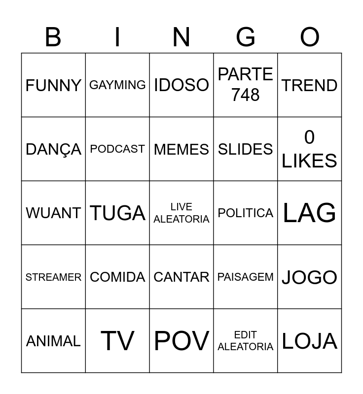 This bingo card has a free space and 24 words: COMIDA, TV, MEMES, ANIMAL, TREND, FUNNY, DANÇA, GAYMING, POLITICA, CANTAR, SLIDES, WUANT, PAISAGEM, JOGO, PODCAST, EDIT ALEATORIA, LAG, IDOSO, 0 LIKES, TUGA, LOJA, STREAMER, PARTE 748 and POV.