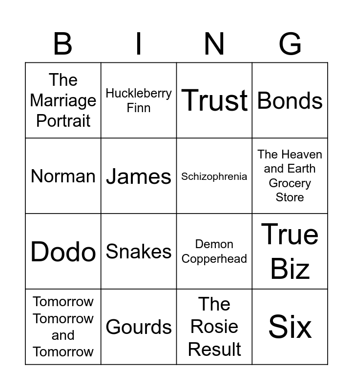 This bingo card has 16 words: Gourds, True Biz, Trust, The Marriage Portrait, Dodo, Huckleberry Finn, Demon Copperhead, The Rosie Result, Norman, James, Tomorrow Tomorrow and Tomorrow, Bonds, Snakes, The Heaven and Earth Grocery Store, Schizophrenia and Six.