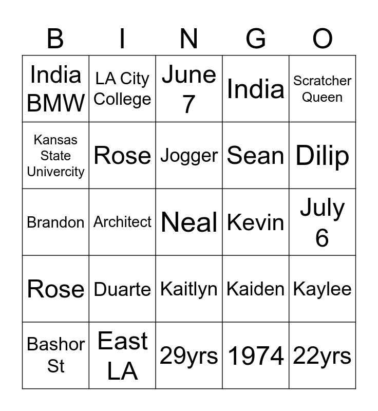 This bingo card has a free space and 24 words: Duarte, East LA, Jogger, Bashor St, Scratcher Queen, India BMW, Kansas State Univercity, LA City College, Kevin, Kaitlyn, Sean, Brandon, Kaiden, Kaylee, Rose, 1974, July 6, June 7, Dilip, Architect, 22yrs, Rose, India and 29yrs.