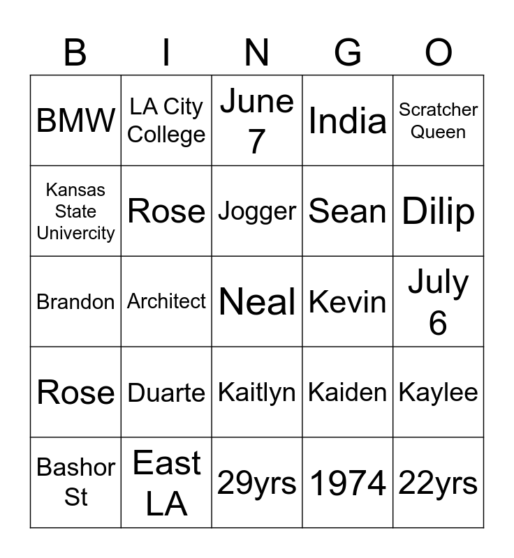 This bingo card has a free space and 24 words: Duarte, East LA, Jogger, Bashor St, Scratcher Queen, BMW, Kansas State Univercity, LA City College, Kevin, Kaitlyn, Sean, Brandon, Kaiden, Kaylee, Rose, 1974, July 6, June 7, Dilip, Architect, 22yrs, Rose, India and 29yrs.