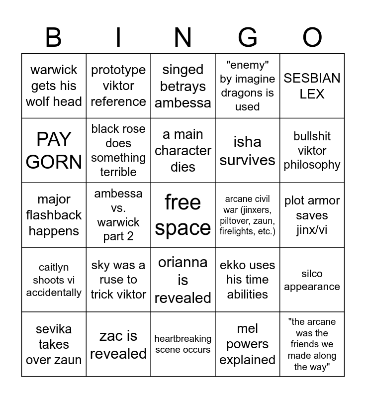 This bingo card has a free space and 24 words: sky was a ruse to trick viktor, zac is revealed, a main character dies, sevika takes over zaun, SESBIAN LEX, warwick gets his wolf head, PAY GORN, prototype viktor reference, arcane civil war (jinxers, piltover, zaun, firelights, etc.), orianna is revealed, isha survives, major flashback happens, ekko uses his time abilities, silco appearance, black rose does something terrible, mel powers explained, plot armor saves jinx/vi, singed betrays ambessa, bullshit viktor philosophy, ambessa vs. warwick part 2, "the arcane was the friends we made along the way", caitlyn shoots vi accidentally, "enemy" by imagine dragons is used and heartbreaking scene occurs.