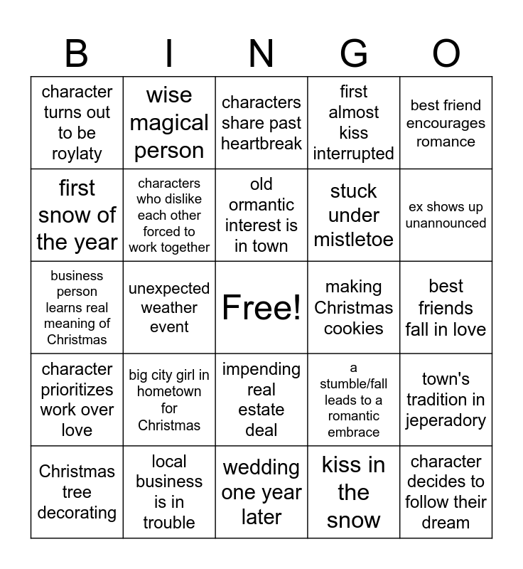 This bingo card has a free space and 24 words: big city girl in hometown for Christmas, local business is in trouble, old ormantic interest is in town, Christmas tree decorating, best friend encourages romance, character turns out to be roylaty, first snow of the year, wise magical person, making Christmas cookies, impending real estate deal, stuck under mistletoe, business person learns real meaning of Christmas, a stumble/fall leads to a romantic embrace, town's tradition in jeperadory, characters who dislike each other forced to work together, kiss in the snow, best friends fall in love, characters share past heartbreak, ex shows up unannounced, unexpected weather event, character decides to follow their dream, character prioritizes work over love, first almost kiss interrupted and wedding one year later.