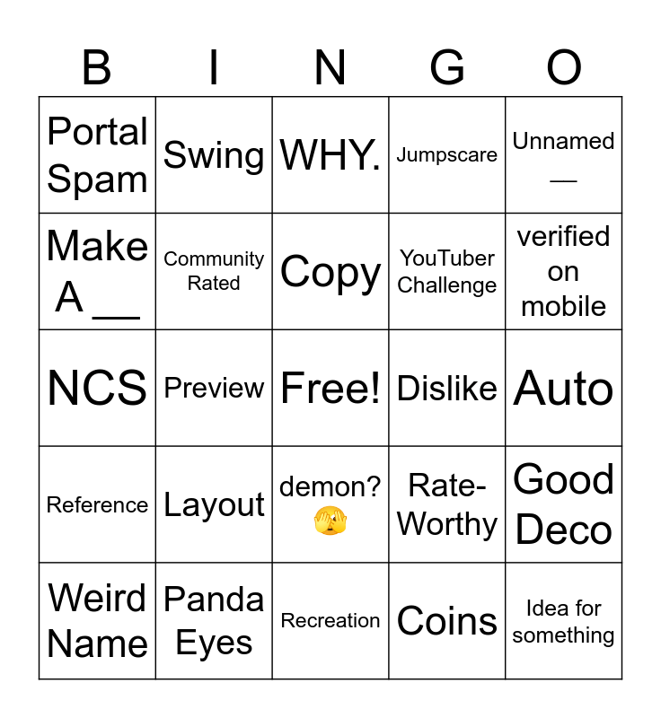 This bingo card has a free space and 24 words: Layout, Panda Eyes, Copy, Weird Name, Unnamed __, Portal Spam, Make A __, Swing, Dislike, demon? 🫣, YouTuber Challenge, NCS, Rate-Worthy, Good Deco, Community Rated, Coins, Auto, WHY., verified on mobile, Preview, Idea for something, Reference, Jumpscare and Recreation.