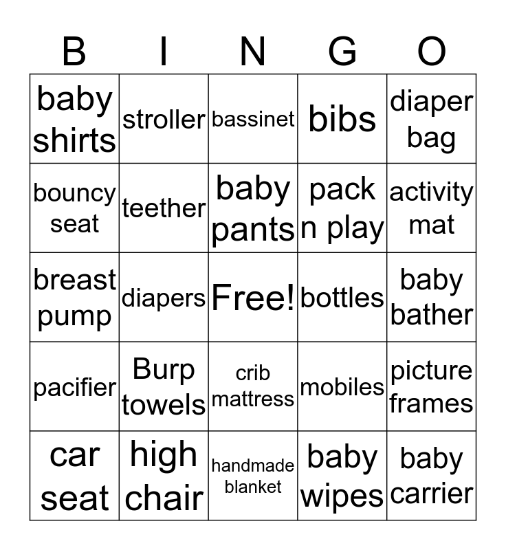 This bingo card has a free space and 24 words: Burp towels, high chair, baby pants, car seat, diaper bag, baby shirts, bouncy seat, stroller, bottles, crib mattress, pack n play, breast pump, mobiles, picture frames, teether, baby wipes, baby bather, bassinet, activity mat, diapers, baby carrier, pacifier, bibs and handmade blanket.