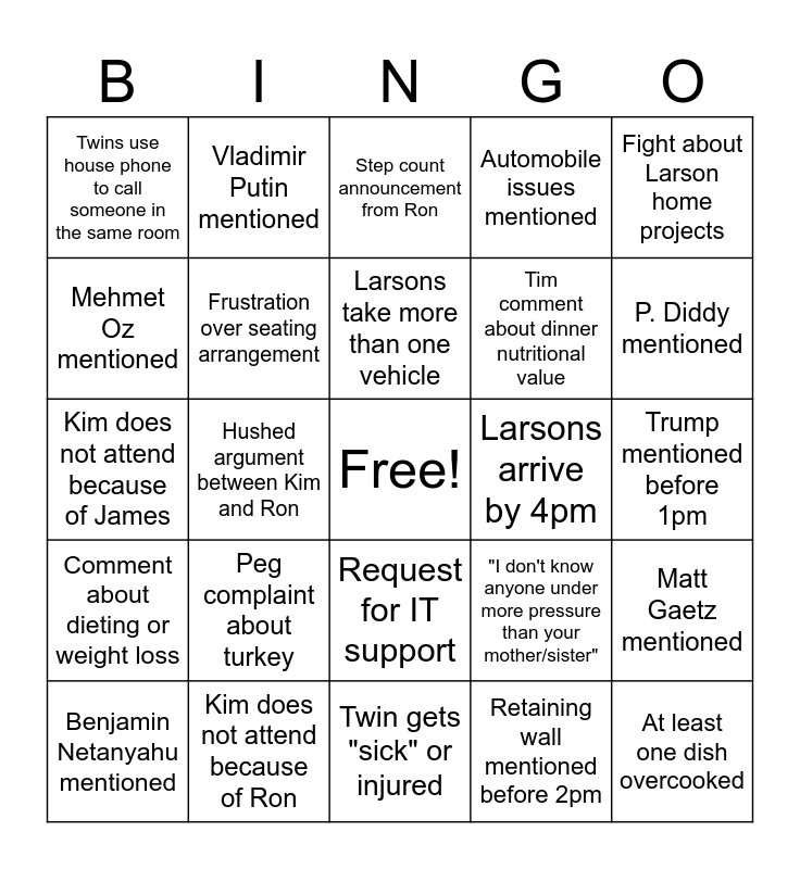 This bingo card has a free space and 30 words: Kim does not attend because of Ron, Elon Musk mentioned, Hushed argument between Kim and Ron, Thermostat mentioned, Twins use house phone to call someone in the same room, Step count announcement from Ron, Frustration over seating arrangement, Request for IT support, Larsons arrive by 4pm, Twin gets "sick" or injured, Trump mentioned before 1pm, At least one dish overcooked, Retaining wall mentioned before 2pm, Kim does not attend because of Tim, P. Diddy mentioned, Twins break object in home, "I don't know anyone under more pressure than your mother/sister", Comment about dieting or weight loss, Peg complaint about turkey, Fight about Larson home projects, Kim does not attend because of James, Crying before 4pm (must be in attendance), Vladimir Putin mentioned, Tim comment about dinner nutritional value, Mehmet Oz mentioned, Automobile issues mentioned, Matt Gaetz mentioned, Benjamin Netanyahu mentioned, Larsons take more than one vehicle and Kim and Peg fight about Cocoa.