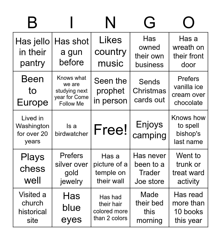 This bingo card has a free space and 24 words: Prefers silver over gold jewelry, Has blue eyes, Seen the prophet in person, Visited a church historical site, Has a wreath on their front door, Has jello in their pantry, Been to Europe, Has shot a gun before, Enjoys camping, Has a picture of a temple on their wall, Sends Christmas cards out, Lived in Washington for over 20 years, Has never been to a Trader Joe store, Went to trunk or treat ward activity, Knows what we are studying next year for Come Follow Me, Made their bed this morning, Knows how to spell bishop's last name, Likes country music, Prefers vanilla ice cream over chocolate, Is a birdwatcher, Has read more than 10 books this year, Plays chess well, Has owned their own business and Has had their hair colored more than 2 colors.