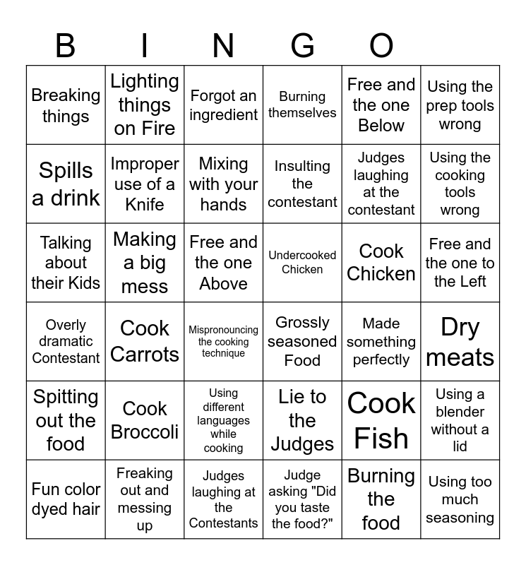 This bingo card has 66 words: Cook Beef, Cook Fish, Cook Pork, Cook Carrots, Cook Broccoli, Someone Cries, Lighting things on Fire, Using the Fryer, Improper use of a Knife, Weird Spaghetti Surprise, Free and the one to the Left, Free and the one to the Right, Free and the one Above, Free and the one Below, Excentric Contestant, Using the prep tools wrong, Using the cooking tools wrong, Breaking things, Free!, Mixing with your hands, Cook Chicken, Undercooked Chicken, Burning themselves, Fun color dyed hair, Cook in the microwave, Burning the food, Judges laughing at the Contestants, Talking about their pets, Talking about their Kids, Mispronouncing seasonings, Mispronouncing the cooking technique, Undercooked Pork, Undercooked Fish, Blender Problems, Overly dramatic Contestant, Grossly seasoned Food, Sexual innuendo, Judges laughing at the contestant, Dry meats, Using too much seasoning, Spills a drink, Using different languages while cooking, Making a big mess, Dancing, Yelling, Freaking out and messing up, Insulting the contestant, Making fun of the contestant, Spitting out the food, Lie to the Judges, Making a salad, Using Carrots, "I don't know what I am doing", Dropping food on the floor, Arguing with the judge about their food being good, Using a blender without a lid, Making a "family recipe", Not following instructions, Forgot an ingredient, Made something perfectly, Judge asking "Did you taste the food?", Flirting with Judge, Judge flirting with contestant, Too Spicy, Too salty and Too bland, or not enough seasoning.