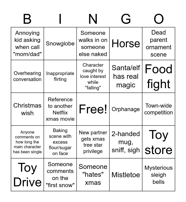 This bingo card has a free space and 29 words: Toy Drive, Carolers, Reference to another Netflix xmas movie, Red sweater, Annoying kid asking when call "mom/dad", Someone walks in on someone else naked, Inappropriate flirting, Baking scene with excess flour/sugar on face, Orphanage, Someone comments on the "first snow", Town-wide competition, Mysterious sleigh bells, Someone "hates" xmas, Mistletoe, Food fight, Overbearing/pushy friend, New partner gets xmas tree star privilege, Anyone comments on how long the main character has been single, Dead parent ornament scene, Christmas wish, 2-handed mug, sniff, sigh, Hat/scarf flies away, Santa/elf has real magic, Overhearing conversation, Horse, Snowglobe, Toy store, Character caught by love interest while "falling" and Accidentally running into someone while on a date.