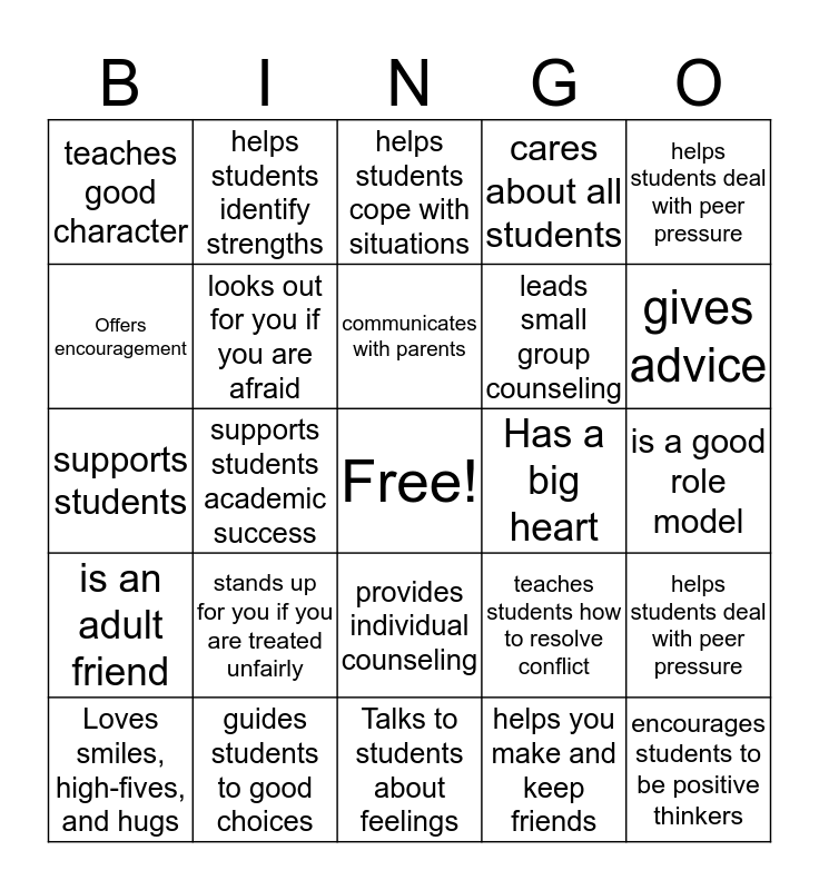 This bingo card has a free space and 29 words: Loves smiles, high-fives, and hugs, reminds you how special you are, supports students academic success, gets help if you are being hurt, teaches good character, helps students cope with situations, looks out for you if you are afraid, stands up for you if you are treated unfairly, Has a big heart, guides students to good choices, is a good role model, encourages students to be positive thinkers, Talks to students about feelings, helps you make and keep friends, gives advice, helps you do your best in school, provides individual counseling, is an adult friend, helps students deal with peer pressure, supports students, teaches students how to resolve conflict, keeps information private, leads small group counseling, Offers encouragement, cares about all students, helps students identify strengths, helps students deal with peer pressure, communicates with parents and helps students in bullying situations.