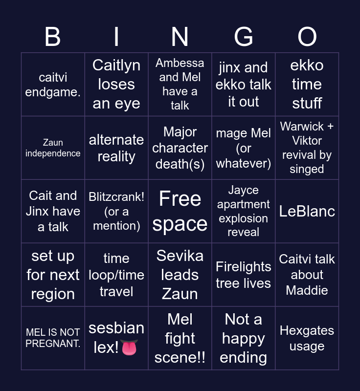 This bingo card has a free space and 24 words: time loop/time travel, sesbian lex!👅, Major character death(s), MEL IS NOT PREGNANT., ekko time stuff, caitvi endgame., Zaun independence, Caitlyn loses an eye, Jayce apartment explosion reveal, Sevika leads Zaun, mage Mel (or whatever), Cait and Jinx have a talk, Firelights tree lives, Caitvi talk about Maddie, alternate reality, Not a happy ending, LeBlanc, Ambessa and Mel have a talk, Warwick + Viktor revival by singed, Blitzcrank! (or a mention), Hexgates usage, set up for next region, jinx and ekko talk it out and Mel fight scene!!.