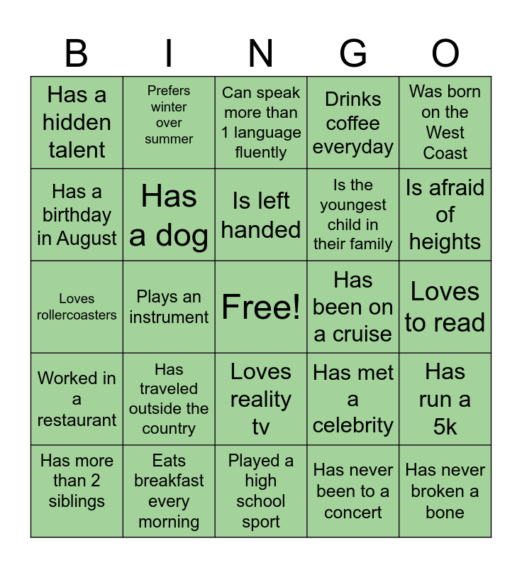 This bingo card has a free space and 24 words: Has more than 2 siblings, Has traveled outside the country, Is left handed, Has never been to a concert, Was born on the West Coast, Has a hidden talent, Prefers winter over summer, Can speak more than 1 language fluently, Has been on a cruise, Loves to read, Loves rollercoasters, Has a dog, Has met a celebrity, Has run a 5k, Has a birthday in August, Eats breakfast every morning, Played a high school sport, Drinks coffee everyday, Is afraid of heights, Worked in a restaurant, Plays an instrument, Loves reality tv, Is the youngest child in their family and Has never broken a bone.