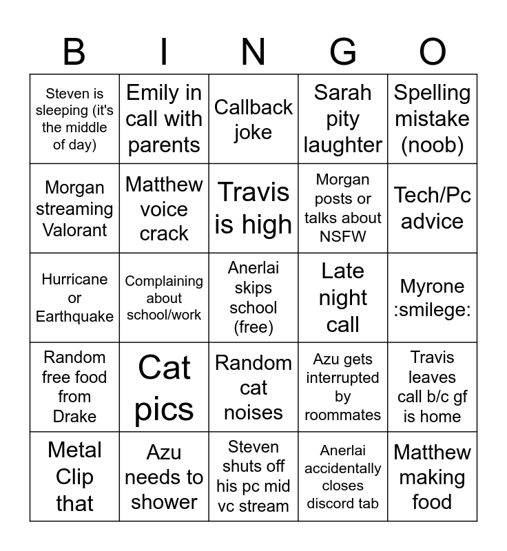 This bingo card has a free space and 24 words: Metal Clip that, Cat pics, Travis is high, Anerlai accidentally closes discord tab, Spelling mistake (noob), Steven is sleeping (it's the middle of day), Emily in call with parents, Callback joke, Late night call, Myrone :smilege:, Hurricane or Earthquake, Matthew voice crack, Azu gets interrupted by roommates, Travis leaves call b/c gf is home, Morgan streaming Valorant, Azu needs to shower, Steven shuts off his pc mid vc stream, Sarah pity laughter, Tech/Pc advice, Random free food from Drake, Complaining about school/work, Random cat noises, Morgan posts or talks about NSFW and Matthew making food.