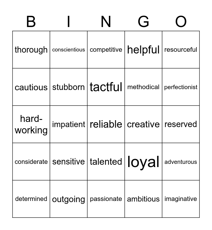 This bingo card has 28 words: adventurous, critical, methodical, ambitious, cautious, competitive, conscientious, considerate, creative, determined, hard-working, helpful, outgoing, passionate, perfectionist, responsible, sensitive, stubborn, tactful, talented, thorough, imaginative, reliable, impatient, reserved, loyal, resourceful and versatile.
