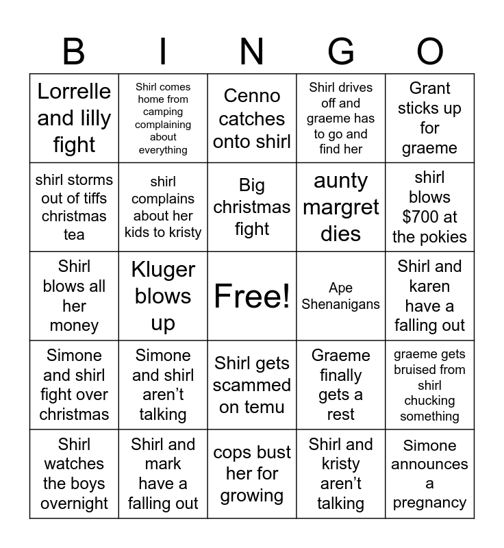 This bingo card has a free space and 24 words: Simone and shirl aren’t talking, Shirl and mark have a falling out, Big christmas fight, Shirl watches the boys overnight, Grant sticks up for graeme, Lorrelle and lilly fight, shirl storms out of tiffs christmas tea, Shirl comes home from camping complaining about everything, Ape Shenanigans, Shirl gets scammed on temu, aunty margret dies, Shirl blows all her money, Graeme finally gets a rest, graeme gets bruised from shirl chucking something, shirl complains about her kids to kristy, Shirl and kristy aren’t talking, Shirl and karen have a falling out, Cenno catches onto shirl, shirl blows $700 at the pokies, Kluger blows up, Simone announces a pregnancy, Simone and shirl fight over christmas, Shirl drives off and graeme has to go and find her and cops bust her for growing.