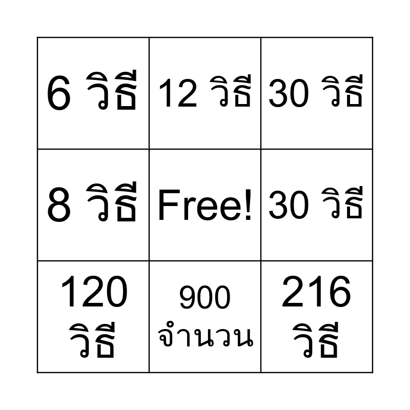 This bingo card has a free space and 25 words: 120 วิธี, 900 จำนวน, 810 จำนวน, 90 จำนวน, 1024 วิธี, 6 วิธี, 12 วิธี, 30 วิธี, 36 วิธี, 60 วิธี, 900 จำนวน, 810 จำนวน, 90 จำนวน, 12 วิธี, 1024 วิธี, 6 วิธี, 36 วิธี, 30 วิธี, 8 วิธี, 26 วิธี, 45 ครั้ง, 84 วิธี, 720 วิธี, 216 วิธี and 5040 วิธี.