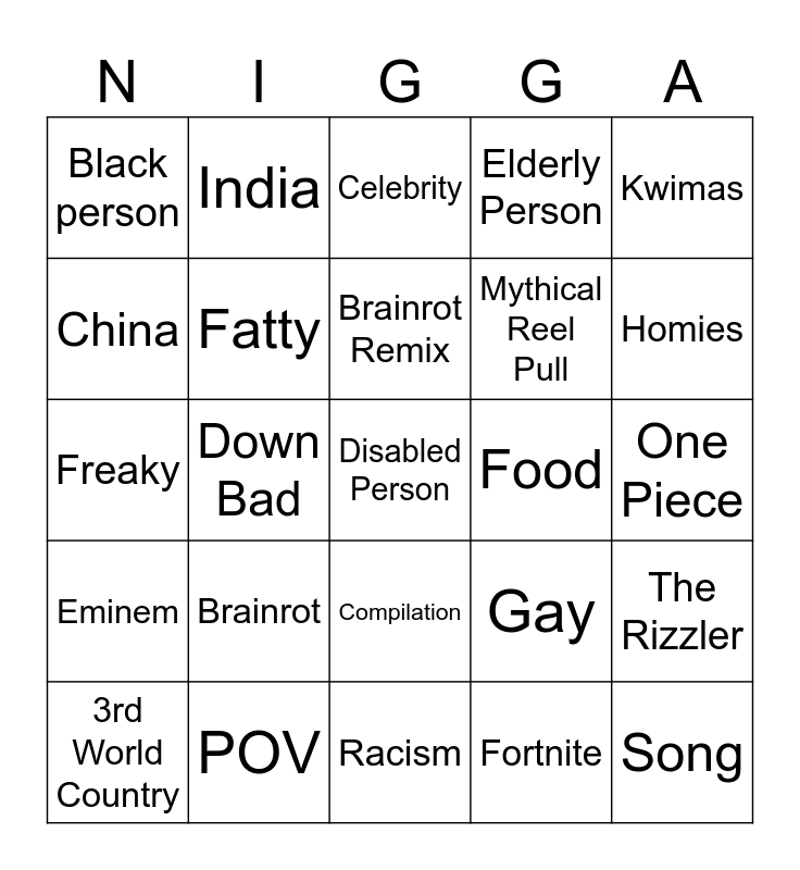 This bingo card has 25 words: Brainrot, Racism, Brainrot Remix, 3rd World Country, Kwimas, Black person, China, India, Food, Compilation, Mythical Reel Pull, Freaky, Gay, The Rizzler, Fatty, Song, One Piece, Celebrity, Homies, Down Bad, Disabled Person, POV, Eminem, Elderly Person and Fortnite.