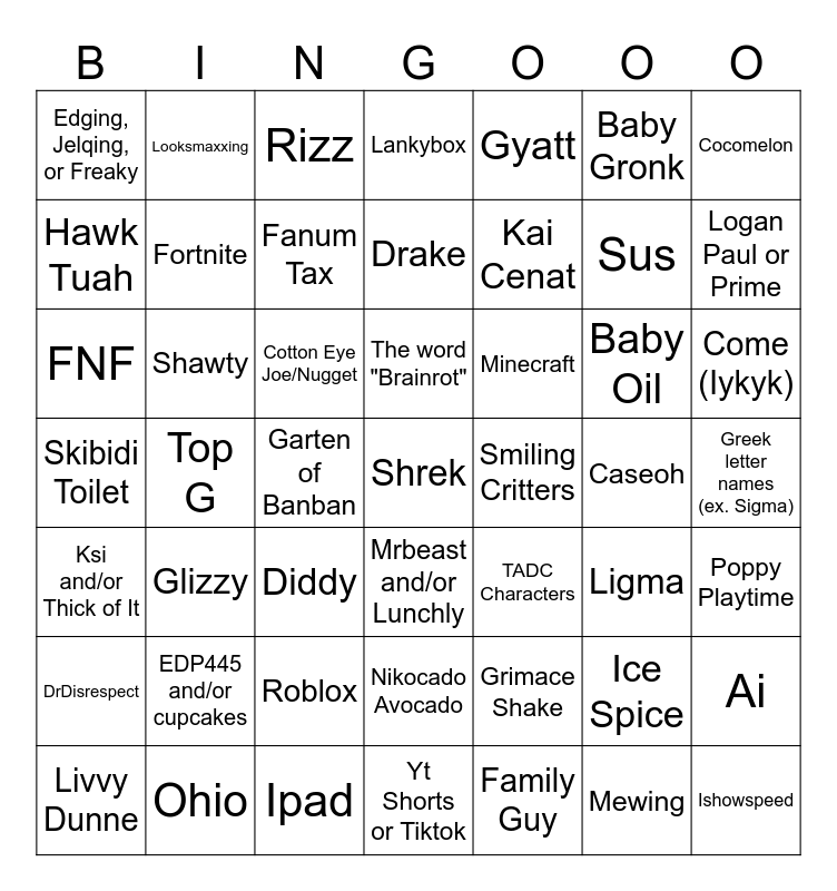 This bingo card has a free space and 48 words: Grimace Shake, Sus, Yt Shorts or Tiktok, Top G, Cotton Eye Joe/Nugget, Greek letter names (ex. Sigma), Looksmaxxing, Ohio, Baby Gronk, Mrbeast and/or Lunchly, Cocomelon, Lankybox, Baby Oil, Minecraft, DrDisrespect, Caseoh, Hawk Tuah, Logan Paul or Prime, Ice Spice, Gyatt, Kai Cenat, Garten of Banban, Edging, Jelqing, or Freaky, Fortnite, Ai, Fanum Tax, Come (Iykyk), Livvy Dunne, The word "Brainrot", Shawty, Mewing, Smiling Critters, Poppy Playtime, EDP445 and/or cupcakes, Skibidi Toilet, TADC Characters, Ligma, FNF, Diddy, Roblox, Ksi and/or Thick of It, Ishowspeed, Rizz, Ipad, Drake, Nikocado Avocado, Glizzy and Family Guy.