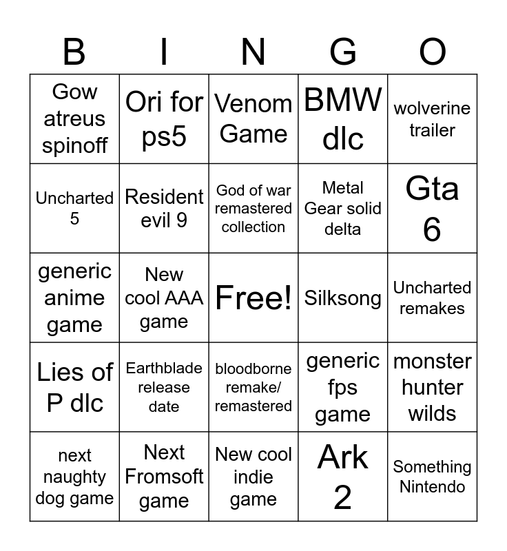 This bingo card has a free space and 24 words: Earthblade release date, Next Fromsoft game, God of war remastered collection, next naughty dog game, wolverine trailer, Gow atreus spinoff, Uncharted 5, Ori for ps5, Silksong, bloodborne remake/ remastered, Metal Gear solid delta, generic anime game, generic fps game, monster hunter wilds, Resident evil 9, Ark 2, Uncharted remakes, Venom Game, Gta 6, New cool AAA game, Something Nintendo, Lies of P dlc, BMW dlc and New cool indie game.
