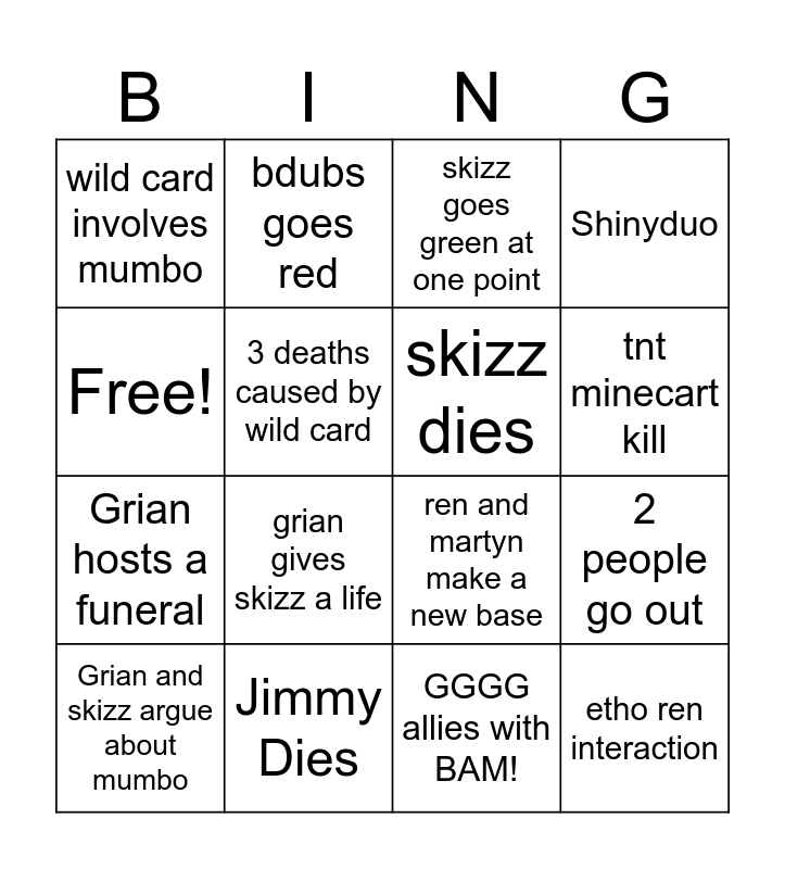 This bingo card has 16 words: Jimmy Dies, 2 people go out, skizz goes green at one point, wild card involves mumbo, Grian hosts a funeral, bdubs goes red, ren and martyn make a new base, GGGG allies with BAM!, Free!, 3 deaths caused by wild card, Grian and skizz argue about mumbo, Shinyduo, grian gives skizz a life, tnt minecart kill, skizz dies and etho ren interaction.